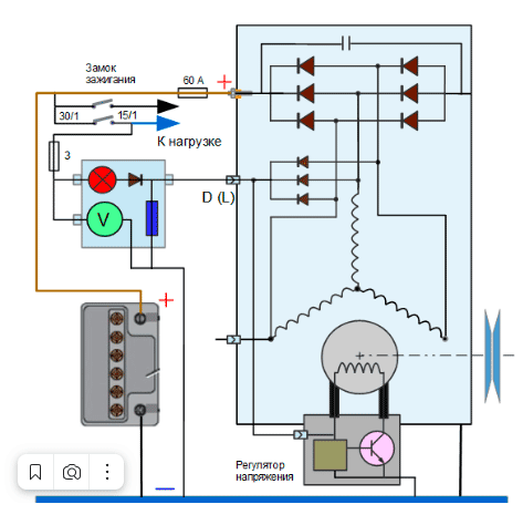 При включении зажигания, ток от аккумулятора идет через контакты замка зажигания, далее через предохранитель 3 и через лампочку в щитке приборов попадает на точку D генератора. Эта точка является выходом дополнительных диодов. Далее ток идет на вход регулятора напряжения. Напряжение действующее на в этой точке открывает транзистор регулятора и ток проходит через щетки в обмотку возбуждения и далее через открытый транзистор на массу.